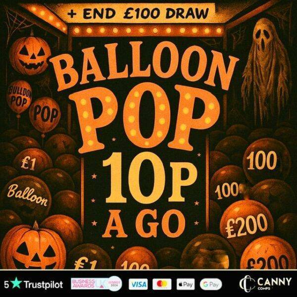 DON’T BE SCARED and give the BALLOON POP a try for only 10p win up to £200 instantly, plus an end £100 draw from all of the entries🎈